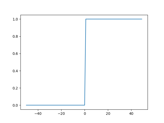 가장 단순한 형태의 함수인 계단함수를 구현하였다. 출력결과를 살펴보자.