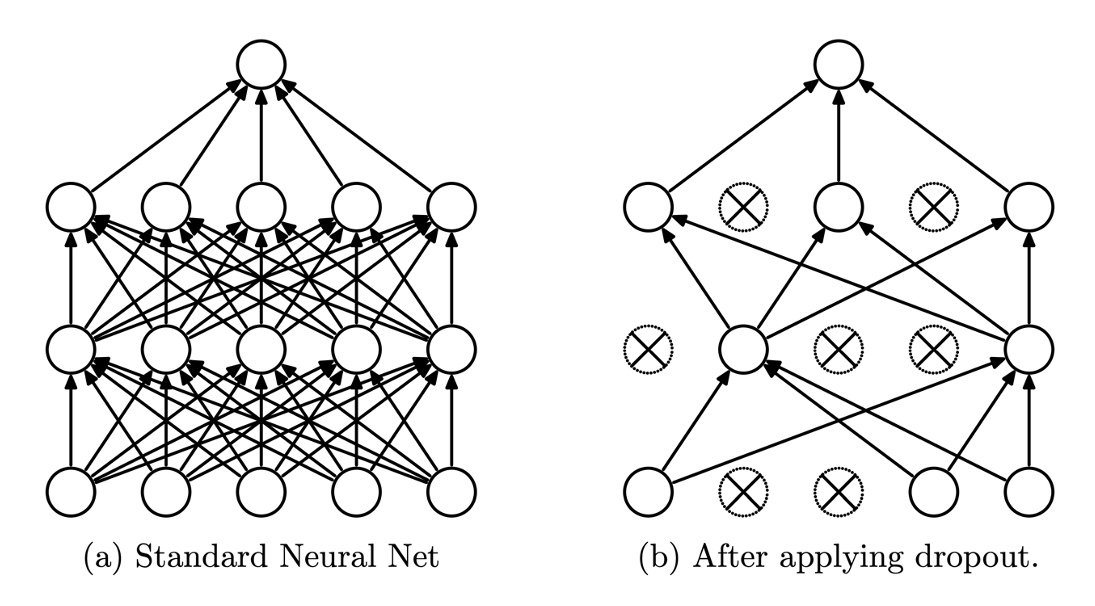 드롭아웃(Dropout)은 일정 비율대로 의도적으로 각 층의 노드들을 죽이는(Drop) 기법이다.