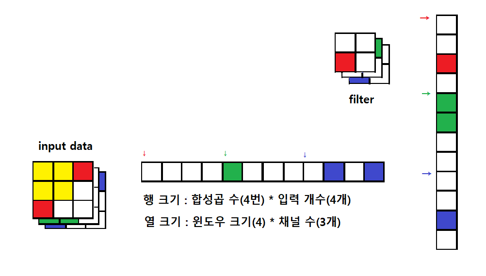 이렇게 필터가 적용되는 구간(윈도우)를 기준으로 데이터를 일렬로 펼치면 행렬 연산이 가능해져서