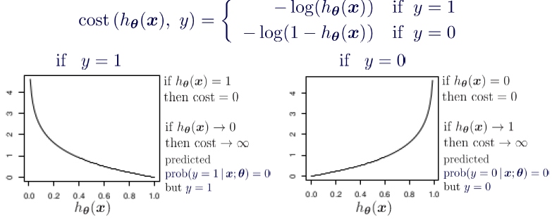 hθ(x) 값이 0.5보다 크다면(양성이라면) log(hθ(x))은 0에 가까울 것이고, log(1-hθ(x))은 -∞에 가까울 것이다.